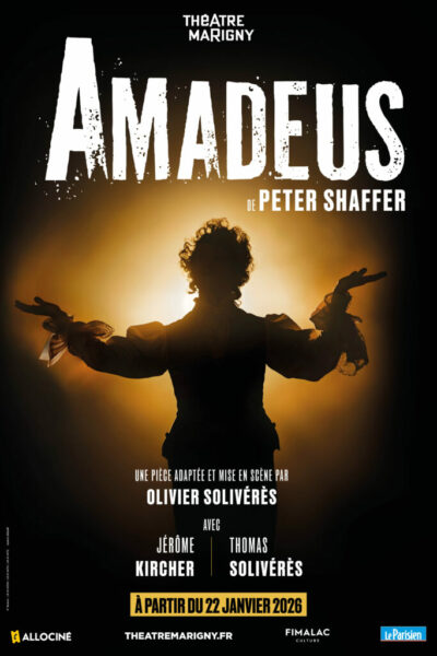 Déjà monté en France au Théâtre Marigny en 1982, Amadeus revient en 2026 sous la direction d’Olivier Solivérès (Molière de la mise en scène pour Le Cercle des Poètes disparus). Porté par une troupe de quatorze artistes mêlant comédiens, chanteurs lyriques et musiciens, avec dans les rôles titres Jérôme Kircher (Salieri) et Thomas Solivérès (Mozart), le spectacle ambitionne de faire résonner à nouveau le mythe dans cet écrin prestigieux des Champs-Élysées.