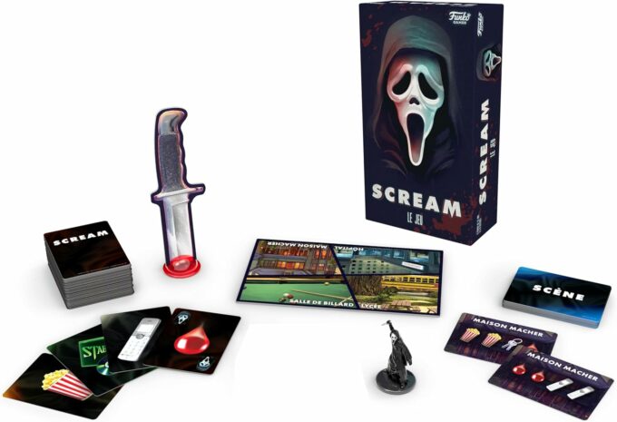 Le matériel est simple mais efficace. La figurine de Ghost Face apporte une touche immersive sympathique, sans être essentielle mécaniquement. On est clairement dans un jeu d’ambiance, pas dans une production luxueuse.
