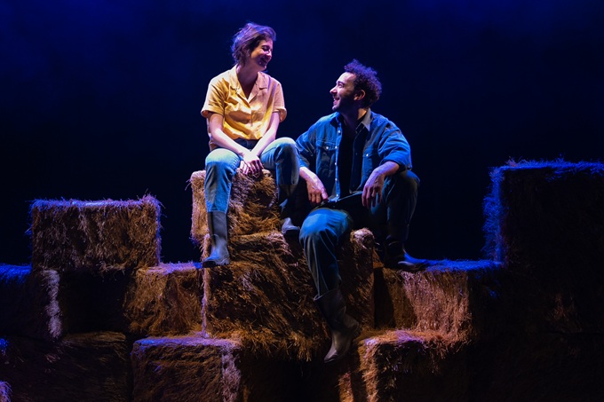 Pour Tout contre la terre, Rémi Couturier fait le choix d’une scénographie épurée, mais d’une redoutable efficacité. Sur scène, quelques bottes de paille constituent l’unique élément de décor. Tour à tour sièges, tables, estrades ou même engins agricoles improvisés, elles témoignent d’une inventivité constante et participent pleinement à la narration. Manipulées par les comédiens, ces structures dessinent sans cesse de nouveaux espaces, rappelant, dans le même mouvement, la pénibilité du travail agricole. À cela s’ajoutent quelques effets discrets mais maîtrisés : une légère fumée évoquant la poussière de la ferme tandis qu’une bande sonore douce, portée par des arpèges de guitare, accompagne avec justesse les moments les plus émouvants. Le travail sur les lumières, quant à lui, permet d’isoler les personnages les uns des autres sur scène, ou de marquer les transitions temporelles, notamment lorsque le présent bascule imperceptiblement dans le souvenir.
